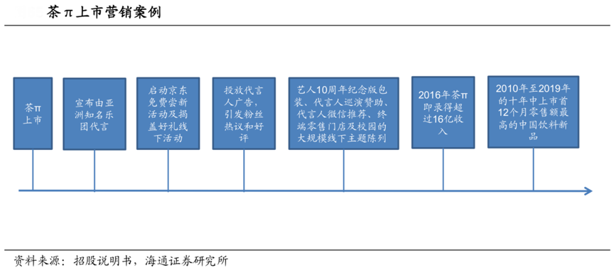 經典案例:根據招股說明書、海通證券研究所等綜合資訊表明,2016年農夫山泉推出的茶飲料[茶π]由亞洲知名樂團代言,展現藝人自成一派背后的辛勤付出,品牌主張迅速贏得了年輕消費者的共鳴,[茶π]推出當年即獲得16 億元的收益。