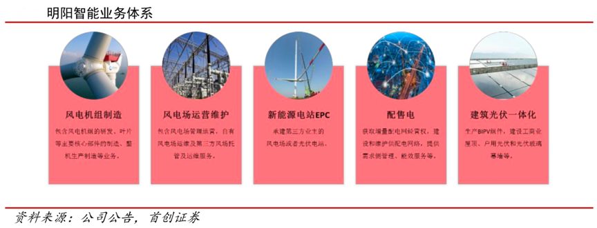 經(jīng)典案例:根據(jù)公司公告、首創(chuàng)證券等綜合資訊表明,明陽(yáng)智能以實(shí)現(xiàn)能源的綠色、普惠和智慧化為使命,以打造清潔能源全生命周期價(jià)值鏈管理與系統(tǒng)解決方案的供應(yīng)商為愿景,目前已逐步發(fā)展成為國(guó)內(nèi)領(lǐng)先、全球具有重要影響力的智慧能源企業(yè)集團(tuán)。主營(yíng)業(yè)務(wù)包括新能源高端裝備制造、新能源電站投資運(yùn)營(yíng)及智能管理業(yè)務(wù)。