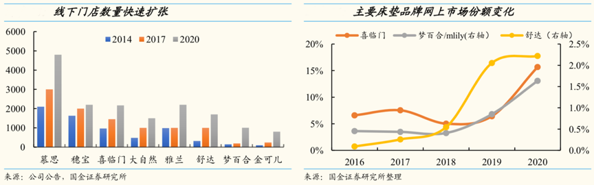 經典案例:根據公司公告、國金證券研究所等綜合資訊表明,自 2014 年以來,床墊門店進入了快速擴張期,所有品牌都開始發力布局線下渠道,2020年喜臨門新增門店 718 家至 2168 家,夢百合 2021 年規劃新開 800 家門店,總門店數有望達1500 家。從線上份額看:喜臨門網上床墊的額市場份額從 6.6%提升至 15.7%,起步較晚的夢百合也從 0.5%提 升至 1.6%,勢頭迅猛。