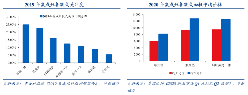 經(jīng)典案例:根據(jù)中關(guān)村在線、奧維云網(wǎng)、華創(chuàng)證券等綜合資訊表明,蒸箱款代表的新功能模塊保持高市場關(guān)注度,且形成較高產(chǎn)品溢價。據(jù)中關(guān)村在線 用戶統(tǒng)計,至 2019 年集成灶關(guān)注度中,蒸烤一體款和蒸箱款位列前兩位,占比分別 為 24.8%、22.3%。同時據(jù)奧維數(shù)據(jù) 2020 年蒸箱款均價較煙灶消款式線上線下均高出約 57%,新功能模塊享受較高市場溢價。而火星人高占比的新模塊 SKU 比例促成其在這一產(chǎn)業(yè)升級浪潮中率先突圍。