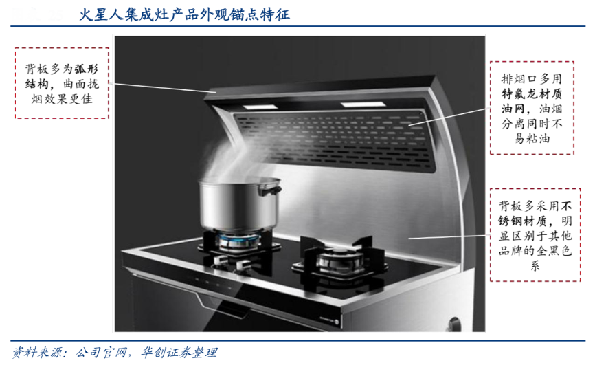 經(jīng)典案例:根據(jù)公司官網(wǎng)、華創(chuàng)證券等綜合資訊表明,火星人旗下產(chǎn)品普遍具有共性的設(shè)計錨點,提升產(chǎn)品功能的同時有效提高辨識度。其采用不銹鋼材質(zhì),與其他品牌不同,火星人集成灶背板部分均采用不銹鋼材質(zhì),銀黑相間的外觀樣式更具辨識度。