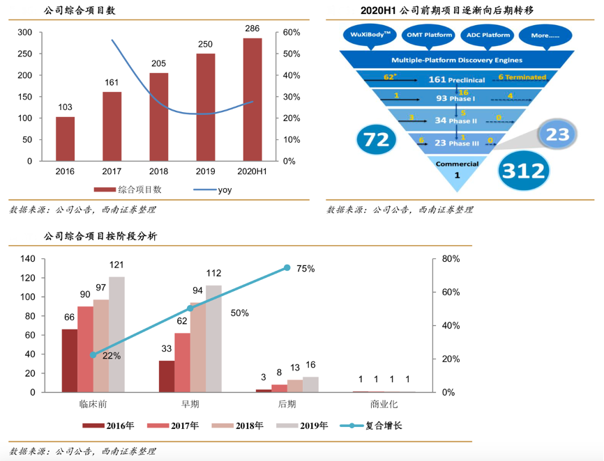 經(jīng)典案例:根據(jù)公司公告、西南證券等綜合資訊表明,藥明生物始終堅(jiān)持“Follow-the-Molecule”的戰(zhàn)略模式,即“跟著藥物分子發(fā)展階段擴(kuò)大業(yè)務(wù)”。生物藥研發(fā)項(xiàng)目粘性較強(qiáng),鎖定早期項(xiàng)目更容易使合作關(guān)系延續(xù)至商業(yè)化生產(chǎn)階 段??蛻羧糇兏?wù)商會(huì)花費(fèi)較高的轉(zhuǎn)讓成本,因此更多客戶傾向選擇全套的研究和生產(chǎn)外包服務(wù)。在公司戰(zhàn)略模式指導(dǎo)下,藥明生物的客戶基礎(chǔ)不斷加大,綜合項(xiàng)目數(shù)由 2019 年同期的 224 個(gè),增長(zhǎng) 27.7%至 2020 年上 半的 286 個(gè)。
