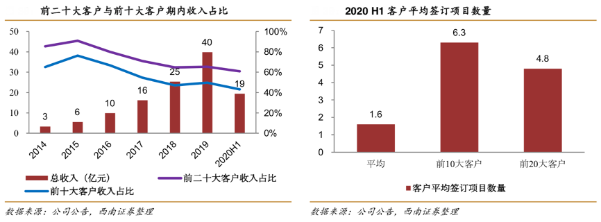 經(jīng)典案例:根據(jù)公司公告、西南證券等綜合資訊表明,近年來(lái),藥明生物公司臨床后期研發(fā)的能力不斷加強(qiáng),越來(lái)越多的公司選擇一貫制服務(wù),即從藥物發(fā)現(xiàn)到臨床試驗(yàn)都由藥明生物來(lái)完成,從其大客戶的情況來(lái)看,2020 年上半年公司前十大客戶的收入占比為 43.1%,其十大客戶的平均簽訂的項(xiàng)目數(shù)量為6個(gè),新項(xiàng)目續(xù)簽率超過(guò)80%。