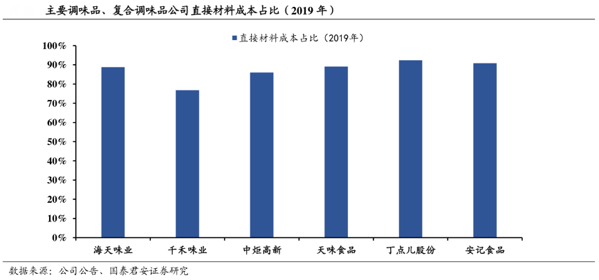 經典案例:根據公司公告、國泰君安證券研究等綜合資訊表明,調味品公司生產過程中所需要的直接材料成本占生產成本比重的80%-95%左右,其中復合調味品企業直接材料成本占比相較于傳統調味品企業更高一籌,因此復合調味料的盈利能力對直接材料價格變動極為敏感。根據天味食品 2018 年數據,天味食品的利潤總額對于直接材料/ 包材價格變動的敏感系數分別達到-2.13/-0.33。