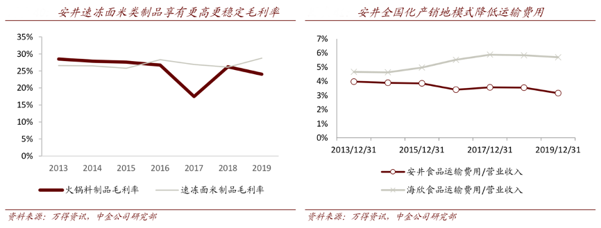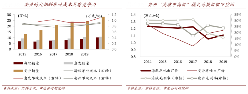 經(jīng)典案例:根據(jù)萬得資訊、中金公司研究部等綜合資訊表明,安井的規(guī)模優(yōu)勢幫助其實現(xiàn)“高質(zhì)中高價”模式,其上游原材料采購上的優(yōu)勢。以魚丸為例,安井通過規(guī)模優(yōu)勢下低原材料采購價格實現(xiàn)產(chǎn)品高魚肉成分的同時成本價相較于其它企業(yè)仍有一定優(yōu)勢。安井在 B 端的高性價比模式被客戶認可且形成一定粘性后,其提價的空間也較為充分。