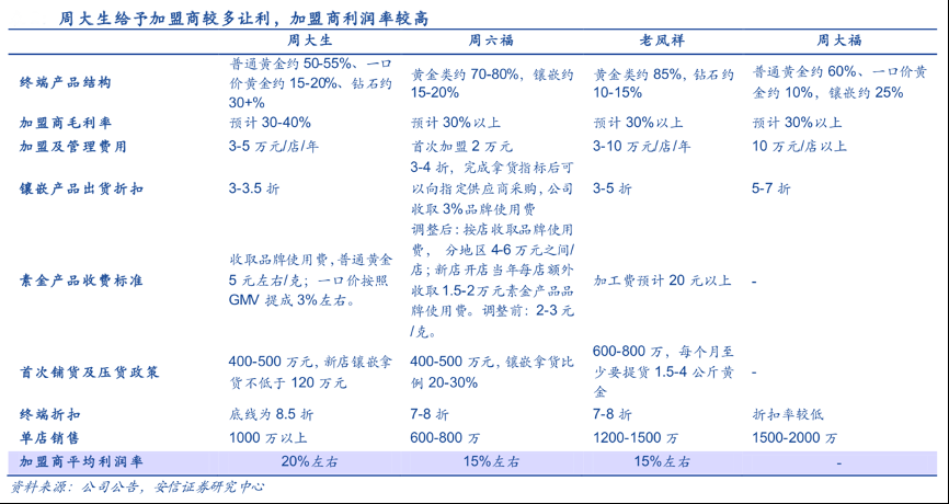 經(jīng)典案例:根據(jù)公司公告、安信證券研究中心等綜合資訊表明,加盟珠寶門店需要較高的一次性鋪 貨資金以及門店裝修等投入,行業(yè)平均水平在 500-1000 萬左右,對加盟商實力要求較高, 各地優(yōu)質(zhì)加盟商數(shù)量有限,是品牌商實現(xiàn)渠道擴張需要深度綁定的資源。周大生給予加盟商較多讓利,加盟商利潤率較高。
