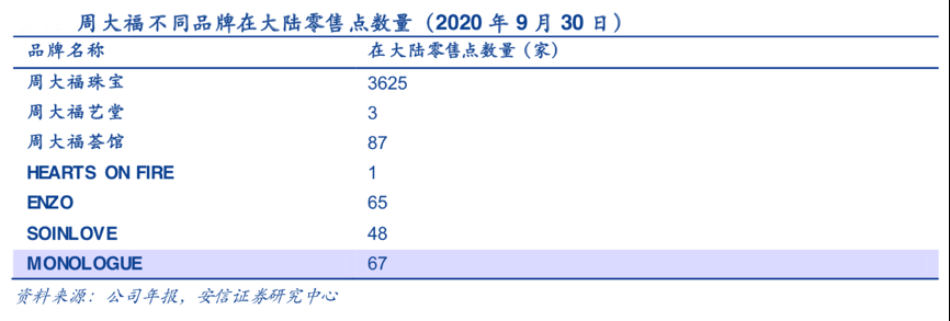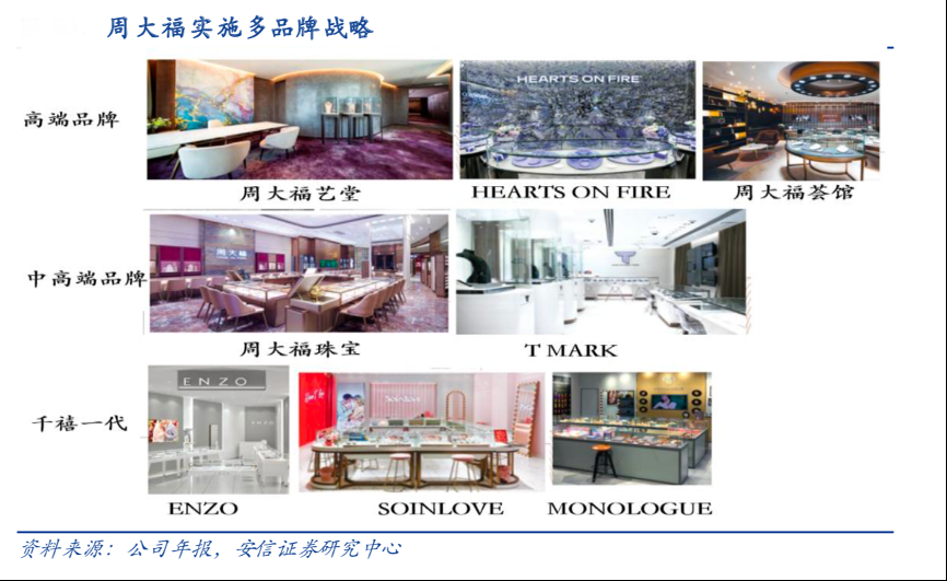 經(jīng)典案例:根據(jù)公司年報、安信證券研究中心等綜合資訊表明,在差異化策略 和產(chǎn)品創(chuàng)新下,周大福公司圍繞三條主線推出了多個品牌,尤其是定位高端客戶:HEARTS ON FIRE (2014)是美國高端鉆石品牌,主打嚴格挑選原石、大師手工切割打磨;周大福薈館(2017) 定位“永致精品”,匯聚東西方精選珠寶;周大福 藝堂(2019)主打“賞藝藏珍”的品牌精神。通過提供多元化設計及服務,其不同定位的產(chǎn)品可以滿足消費者不同人生階段的首飾需要,完善的品牌矩陣利于拓寬消費場景、 增強顧客忠誠度。