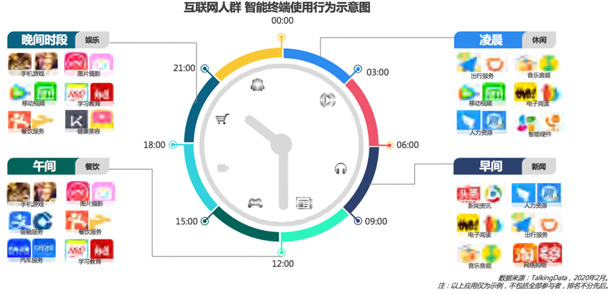根據(jù)TalkingData等綜合資訊表明,互聯(lián)網(wǎng)人群智能終端使用已經(jīng)“全天侯”了,各類別應(yīng)用已經(jīng)滲入到人們生活的方方面面,休閑、新聞、餐飲、娛樂等應(yīng)用24小時影響著人們的消費(fèi)行為,圖片攝影、手機(jī)游戲、餐飲服務(wù)、學(xué)習(xí)教育類等應(yīng)用早晚活躍差距較大,“午休”和“晚間黃金時段”成為用戶經(jīng)營的核心時間段。