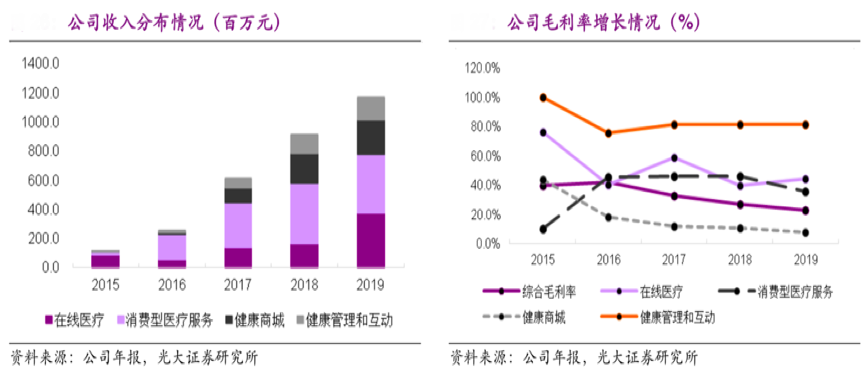 經典案例:據平安公司年報、光大證券研究所等綜合資訊表明,2019 年,平安好醫生在線醫療的業務收入為人民幣 8.58 億元(+108.9%),其中下半年收入 5.2億元(+135%),呈現加速增長趨勢,主要來自于會員服務類產 品(包括就醫 360、平安好醫生私家醫生)、及伴隨在線問診服務產生的電子處方銷售等業務的增長。