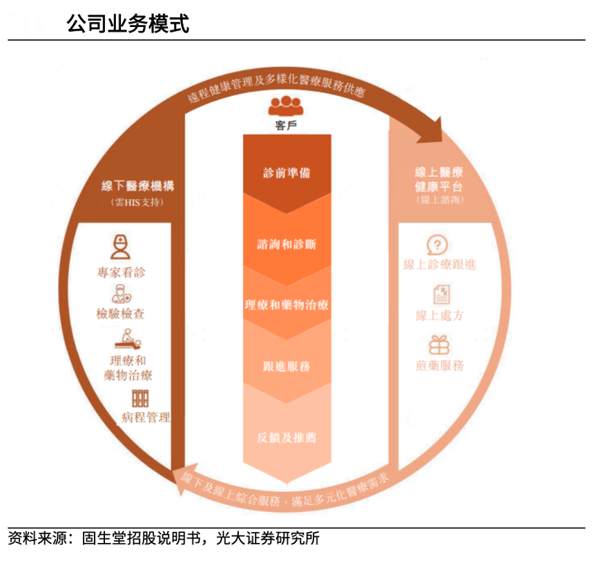 經典案例:根據固生堂招股說明書、光大證券研究所等綜合資訊表明,固生堂以基礎醫療為重心,建立了線上醫療健康平臺與線下醫療機構相結合的中醫平臺,并將中醫和西醫結合,為客戶提供貫穿疾病診療和醫療健康管理全過程的全面醫療健康解決方案。