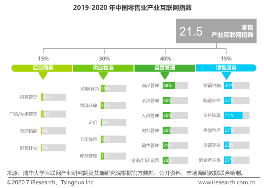 傳統(tǒng)的零售產業(yè)經營產業(yè)鏈效率低,“零售產業(yè)互聯(lián)網”的發(fā)展讓產業(yè)鏈經營日趨完善&更加高效。傳統(tǒng)零售供應鏈條呈現線性狀態(tài),各參與方之間依次進行信息交換,渠道層級多,信息流、資金流等傳遞慢。根據清華大學互聯(lián)網產業(yè)研究院及艾瑞研究院、公開資料等綜合資訊表明,隨著零售產業(yè)互聯(lián)網的發(fā)展,零售產業(yè)互聯(lián)網中的“產業(yè)互聯(lián)網指數”高低次序依次為:運營管理>供應物流>銷售服務>后臺商務,以商品管理、會員管理、人員管理、財務管理及鉩 管理為代表的“運營管理產業(yè)互聯(lián)網指數”遠高于其它產業(yè)互聯(lián)網環(huán)節(jié)。
