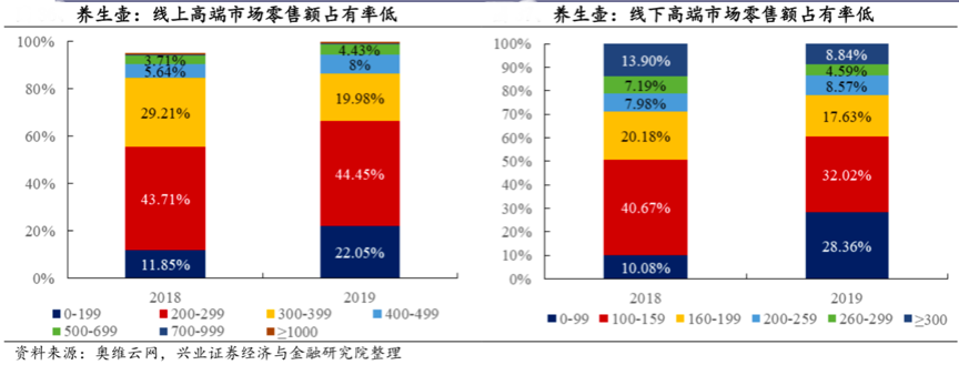 經典案例:根據奧維云網、興業證券經濟與金融研究院等綜合資訊顯示, 2019 年中國養生壺線上產品集中于200-299 元價格帶,線下產品多集中于 100-159 元價格帶,北鼎品牌養生壺均價為 600 元, 并已經成為2018年線上市場TOP 3品牌,說明北鼎的高端定位獲市場認可。