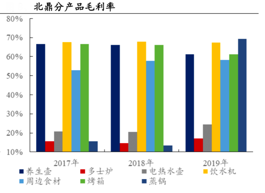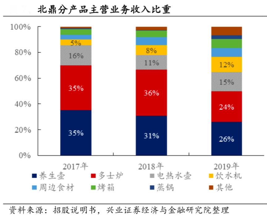 經典案例:根據北鼎股份的招股說明書、興業證券經濟與金融研究院等綜合資訊表明,從品類結構看,北鼎股份廚房小家電品類齊全,養生壸、多士爐仍是主流品類,飲水機、周邊食材、烤箱等產品占比日益上升,2019年其占主營業務收入占比分別為 11.9%、7.0%、6.9%,其產品結構化競爭力凸顯。