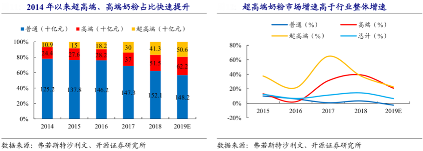 經典案例:根據弗斯特沙利文、開源證券研究所等綜合資訊表明,2014年以來超高端、高端奶粉占比快速提升,超高端奶粉市場增速高于行業整體增速。中國超高端奶粉、高端奶粉占比分別自 2014 年的 6.8%、15.2%增至2018 年的 16.9%、21%。超高端奶粉、高端奶粉發展較快,2014-2018 年復合增速分別達 39.5%、11.2%,快于行業整體 11.2%的增速。
