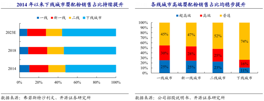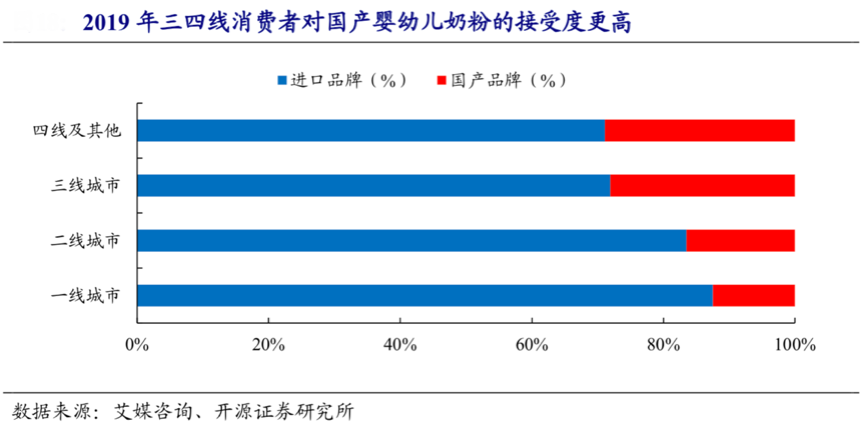 經典案例:根據艾媒咨詢、開源證券研究所等綜合資訊表明,2019年一二線購買國產品牌奶粉的意愿分別為12.5%、16.5%;三四線購買國產品牌奶粉的意愿分別為 28.1%、28.9%。三四線城市消費者對國產品牌的接受度更高。未來隨著國產奶粉企業品牌力持續提升,品牌信心增強,國產品牌仍有較大發展潛力。