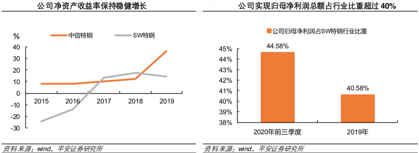 經(jīng)典案例:根據(jù)wind、平安證券研究所等綜合資訊表明,中信特鋼盈利能力強大,2015年以來盈利能力一直保持穩(wěn)健增長。2019 年公司資產(chǎn)重組實現(xiàn)整體上市后,公司盈利絕對額占 SW 特鋼 14 家上市公司盈利總額比重超過40%,盈利規(guī)模位居行業(yè)之首。