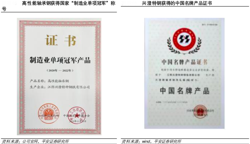 經(jīng)典案例:根據(jù)公司官網(wǎng)、wind、平安證券研究所等綜合資訊表明,中信特鋼是中國鋼鐵工業(yè)協(xié)會副會長單位和中國特鋼企業(yè)協(xié)會會長單位,在中國特鋼行業(yè)居主導(dǎo)地位,發(fā)揮著“風(fēng)向標”作用;2019年,子公司興澄特鋼高性能軸承鋼獲得工信部發(fā)布 “制造業(yè)單項冠軍”稱號;青島特鋼 1960MPa 級 橋 梁纜索盤條榮獲中國鋼協(xié)頒發(fā)的“中國鋼鐵工業(yè)產(chǎn)品開發(fā)市場開拓獎”。