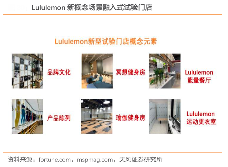 經典案例:根據fortune.com、mspmag.com、天風證券研究所等綜合資訊表明, Lululemon提出“新概念場景融入式門店”,旨在為客群提供一體化場景式購物體驗,探索關聯行業協同運營可行性:試驗門店中開辟“店中店”形式健身房,提供瑜伽、冥想低熱及綜訓等高熱活動課程服務,并提供咖啡餐飲服務,同時配合推廣 mirror 智能健身產品服務。