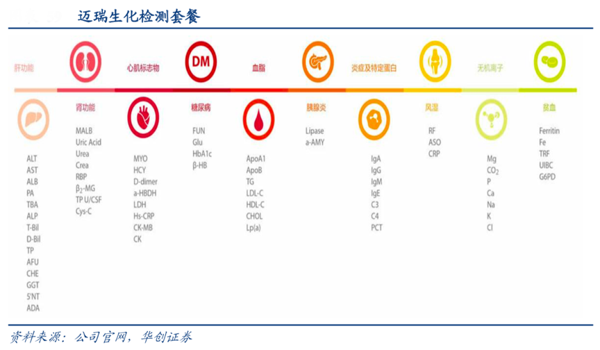 經典案例:根據公司官網、華創證券等綜合資訊表明,2003年,邁瑞發布中國第一臺全自動生化分析儀。2014年,邁瑞發布全自動生化免疫流水線,可根據實際檢測需要,靈活配置不同檢測速度的生化和免疫模塊,為不同規模、級別的醫療機構及實驗室提供定制化的組合方案。邁瑞生化試劑產品涵蓋肝功、腎功、心血管、糖尿病、血脂、胰腺炎等套餐,建立了完整的產品開發技術平臺。