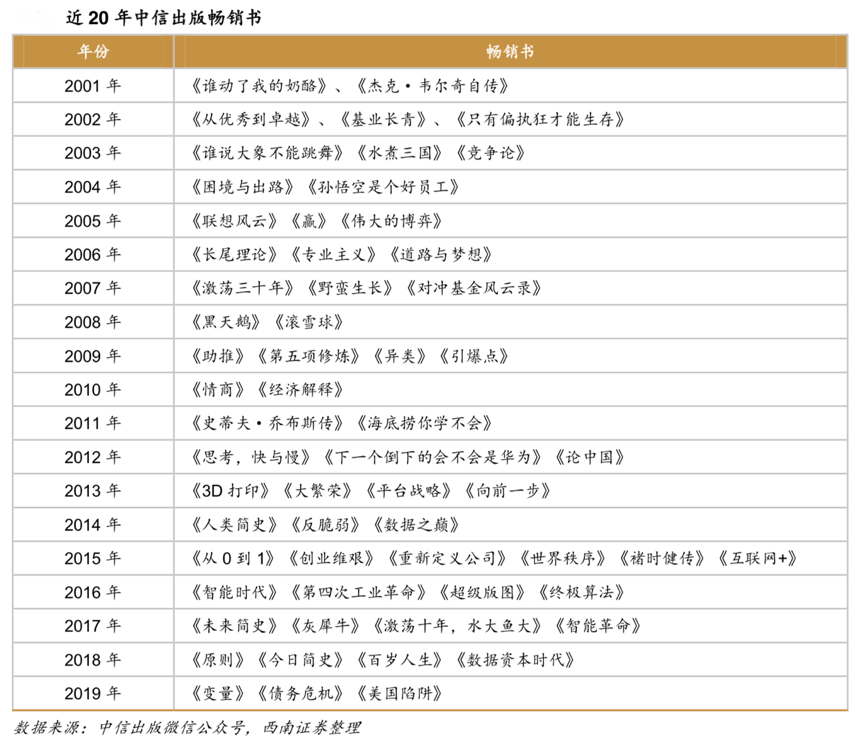 經典案例:根據中信出版微信公眾號、西南證券整理等綜合資訊表明,近 20 年,中信出版向全社會輸送了大量優質的圖書,將國外的先進理念引進來,也 將國內的知識文化向全社會輸出,服務了全球超過 11000 位作者。經管社科類書籍一直是公司的一張名片,其在資源采購、翻譯出版、發行銷售等方面均具有充分的經驗,曾推出許多暢銷書,“灰犀牛”“黑天鵝”等概念現已成為常用的經濟學概念。