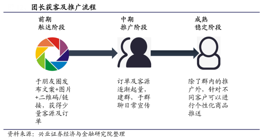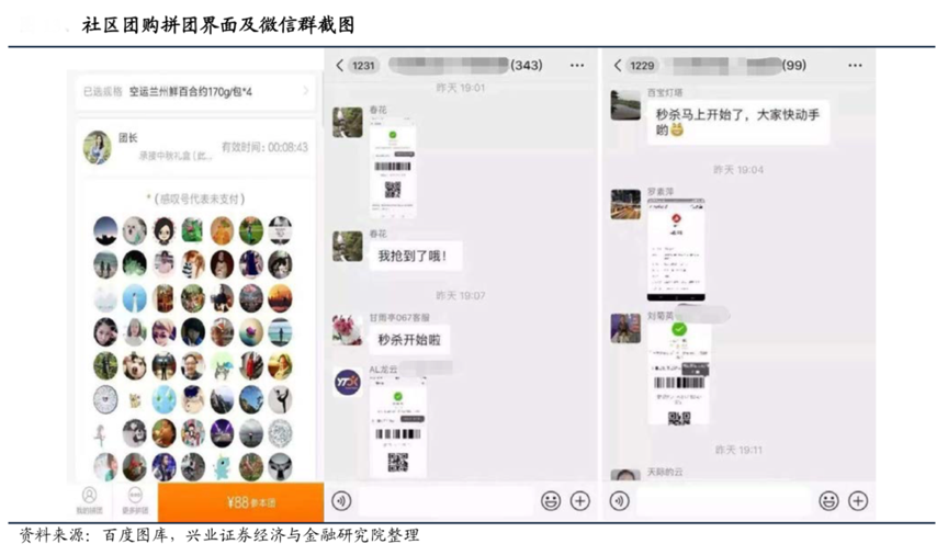 經(jīng)典案例:根據(jù)興業(yè)證券經(jīng)濟(jì)與金融研究院等綜合資訊表明,對(duì)于居住在社區(qū)附近的業(yè)主或者租戶而言,通過(guò)熟人網(wǎng)絡(luò)購(gòu)買、同社區(qū)用戶的相互介紹等,加上群里面團(tuán)長(zhǎng)的互動(dòng),加入了更加可靠的社交元素,整體上用戶交互體驗(yàn)更好,信任感更強(qiáng),同時(shí)經(jīng)由社交軟件擴(kuò)散的途徑能夠廣泛觸達(dá)社區(qū)居民。