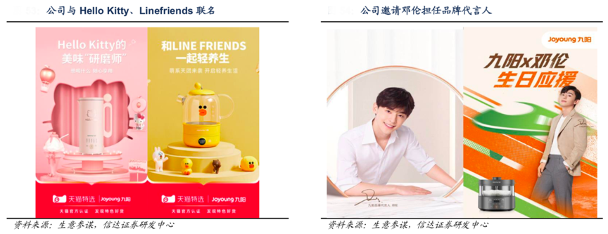 經典案例:根據生意參謀、信達證券研發中心等綜合資訊表明,九陽公司跟隨市場趨勢推出Hellokitty、LineFriends 等一系列“IP”聯名產品,通過可愛、生動的產品外觀可以改變電器類產品固有的呆板形象,并于2019 年邀請鄧倫成為公司品牌形象大使,利用藝人的社會影響力進一步強化品牌的年輕定位,并通過參與粉絲活動等擴大品牌社會影響力,提升品牌日常活躍度。