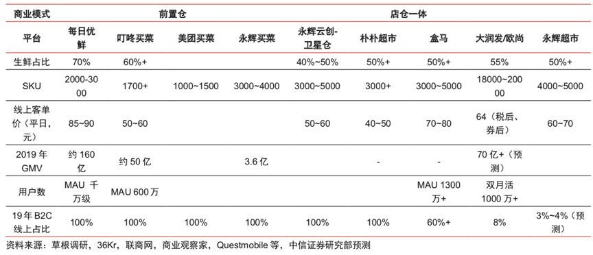 根據草根調研、36kr、聯商網、商業觀察網、Questmobile、中信證券研究部預測等綜合資訊表明,國內生鮮到家模式大多創始不久,區域布局多在一二線城市,生鮮占比多在50%以上,線上客單價多在60元以下,線上成為其主要戰場,這些鮮明的特征告訴我們,“生鮮品類結構”構建是生鮮到家模式中關鍵的一環,強有力的生鮮商品是優質流量入口,更是生鮮到家模式毛利“調節器”。