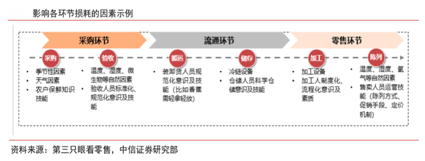 建立健全專業化的“生鮮供應鏈”需要減少不必要的生鮮產業鏈損耗,提升生鮮美食的商品競爭力。根據第三只眼看零售、中信證券研究部等綜合資訊表明,采購環節、流通環節及零售環節等各生鮮產業鏈環節都存在一定的“生鮮損耗”,優秀的生鮮零售品牌需要從上游商品化、中游市場化和下游品牌化“產業鏈整合”入手,提升區域內網點密度以實現快速配送,提升“供應鏈水平”強化產品豐富度、品質、價格等,從整體上提升生鮮新零售平臺競爭力。