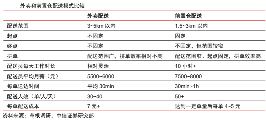 生鮮到家的配送效率是優秀生鮮品牌致勝市場的重要一環。據草根調研、中信證券研究部等綜合資訊顯示,外賣和前置倉配送模式有所不同,外賣配送的范圍廣、區域大、快遞人員時間自由,這些決定了其配送效率有限及配送人效不高,而“前置倉配送”配送區域相對固定、配送范圍相對集中、訂單相對多樣,其配送人效比較高,也可極大提升配送的整體競爭力。