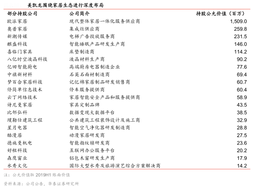 家居產業鏈整合大大加劇,優勢產業鏈“鏈主”正在崛起。據紅星美凱龍公司公告、華泰證券研究所等綜合資訊表明,其正積極在家居生態鏈進行投資布局,投資了歐派家居等知名企業。截至 2019H1,公司通過投資公司間接持有歐派家居3.00%股份,通過香港子公司間接持有奧普家居4.24%股份,直接持有新潮傳媒 2.19%股份,通過子公司持有夢百合家居科技 1.10%股份。