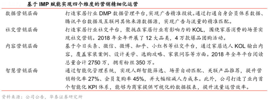 經典案例:據公司公告及華泰證券等綜合資訊表明,2018 年 10 月,騰訊與紅星美凱龍在構建“數字化運營體系”、營造“家居行業數字化生態”等領域開展合作,持續建設 IMP(全球家居智慧營銷平臺);基于IMP賦能其可以實現四個維度的營銷精細化運營。