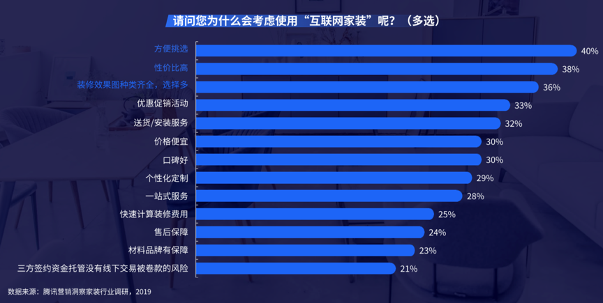 傳統家裝業務涉及到建材家居產品選擇、家居生活方案設計、家居風格挑選、施工隊伍選擇等多個環節,互聯網家裝在數字化技術加持下下單更便捷、消費更快速、設計方案更集成化,根據騰訊營銷洞察家裝行業調研等綜合資訊表明,采購便捷、性價比高、效果全選擇多是互聯網家裝極具魅力的“三大吸引點”,這是家居消費數字化和智能化的必然結果,也是互聯網家裝新零售企業的相對競爭優勢所在。