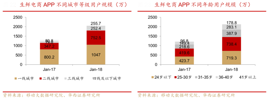 生鮮消費用戶量持續增長,年輕化特征明顯,生鮮時尚化、品質化和年輕化消費特征突出。根據移動大數據、華西證券研究所等綜合資訊表明,在 2017 年 8 月-2018 年 8 月期間,生鮮電商在三四線及以下城市用戶規模增長在 200%以上,36歲以上人群用戶增長接近90%,隨著冷鏈物流的發展,生鮮電商的布局下沉,以及隨著年齡增長和消費習慣的培養,生鮮電商有望保持高速增長,在生鮮消費中的占比將持續提升。