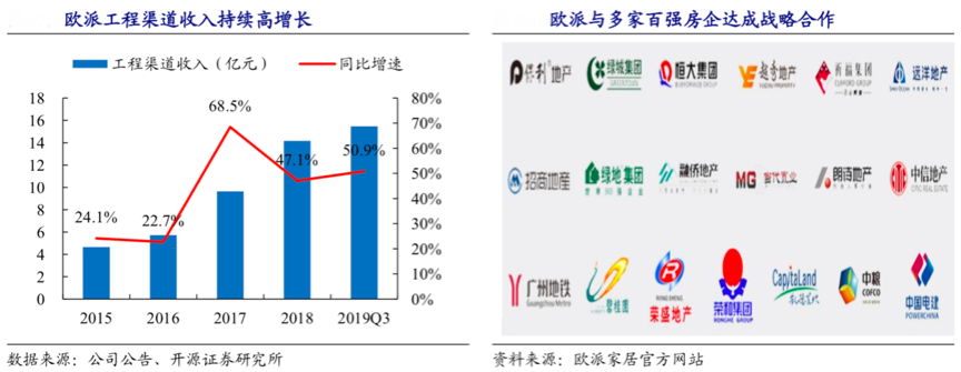 經(jīng)典案例:根據(jù)公司公告、開源證券研究所、歐派家居官網(wǎng)等綜合資訊表明,2019 年前三季度,歐派公司大宗業(yè)務收入 15.5 億元,同比增長 50.8%,其已與萬科、綠城、恒大等多家國內(nèi)知名百強房企建立了長期戰(zhàn)略合作關系。根據(jù)公司官網(wǎng)數(shù)據(jù),地產(chǎn)百強企業(yè)中同歐派簽訂戰(zhàn)略合作協(xié)議的有 20 多家,長期合作的約有 70 多家。