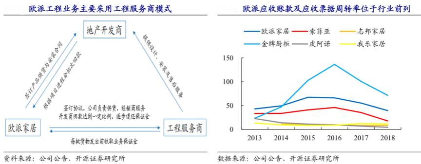 同時,根據(jù)公司公告、開源證券研究所等綜合資訊表明,歐派的大宗業(yè)務主要采用工程服務商模式。在項目過程中,工程服務商除先行承擔設計、安裝及 售后服務發(fā)生的所有相關費用外,還需為該項目中公司尚未收到的凈應收貨款提供 相應等額的保證金。歐派優(yōu)質(zhì)的工程服務商隊伍和全國化產(chǎn)能布局也保證 了歐派工程端出色的交付能力。