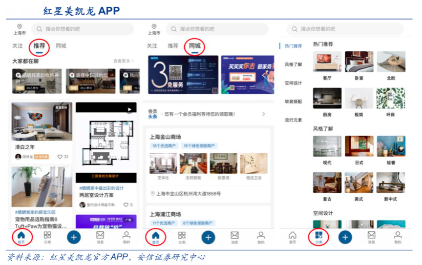 經(jīng)典案例:紅星美凱龍推出的官方終端 APP 已經(jīng)實現(xiàn)了“泛家居”網(wǎng)絡(luò)營銷,推動了門店數(shù)字化、會員數(shù)字化等前端數(shù)字營銷的高效經(jīng)營,同步牽引數(shù)字運(yùn)營管理等快速進(jìn)化。根據(jù)紅星美凱龍官方APP、安信證券研究中心等綜合資訊表明,其官方 終端 APP,主推家具建材、家居裝飾、家裝的內(nèi)容分享,還可提供同城商場詳細(xì)的樓層地圖及店鋪分布,為線下商城提供引流。“泛家居”內(nèi)容營銷能夠相對提升用戶使用頻率,為線下店鋪引流。