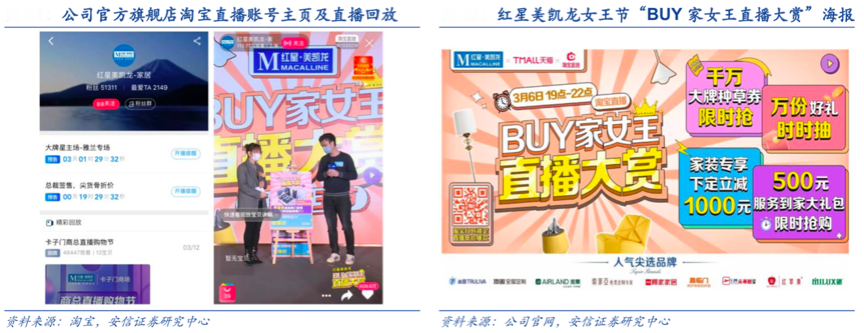 經(jīng)典案例:根據(jù)淘寶網(wǎng)、安信證券研究中心等綜合資訊表明, 2020 年 3 月 6 日,紅星美凱龍女王節(jié)“BUY家女王直播大賞”的淘寶直播間中,紅星美凱龍協(xié)同 6 城線下分會場,顧家、喜臨門、雅蘭、索菲亞、芝華仕、頂固、沁園、米蘭之窗、紅蘋果等 9 大家居品牌亮相紅星美凱龍?zhí)詫氈辈ラg,當(dāng)晚直播間實時觀看人數(shù)超過 112 萬,實現(xiàn)商品點擊超 5.4 萬次,家具爆款下訂 17400 單,“服務(wù)到家”居家保潔 業(yè)務(wù)收獲 2143 個訂單,“紅星美凱龍網(wǎng)家裝平臺”家裝業(yè)務(wù)達(dá)成 3174 個訂單,極大提升了紅星美凱龍的線上線下互動價值。