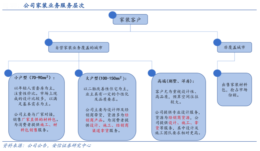 經(jīng)典案例:根據(jù)公司公告、安信證券研究中心等綜合資訊表明,紅星美凱龍的家裝服務(wù)精準(zhǔn)劃分客戶群,滿足消費者相應(yīng)需求,主要以自營的家裝服務(wù)來滿足客戶需求,公司采用設(shè)計師及工程隊包工頭為內(nèi)部人員,施工工人以外包形式獲得。目前公司家裝布局主要包括:提供全系列家裝服務(wù)的紅星·家倍得(成立于 2014 年)、紅星美凱龍網(wǎng)家裝平臺(成立于 2016 年),以及用于家裝設(shè)計的線上平臺——設(shè)計云。自 2019 年 下半年起,家裝業(yè)務(wù)進(jìn)入快速發(fā)展階段,全年(集中在下半年)家裝業(yè)務(wù)合 同金額近 32 億元,實現(xiàn)銷售及家裝收入 5.69 億元,家裝服務(wù)獲得了大發(fā)展。