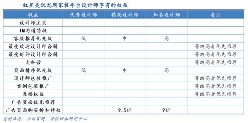 經(jīng)典案例:根據(jù)公司官網(wǎng)、安信證券研究中心等綜合資訊表明,其推出了“設(shè)計家裝就一站”的紅星美凱龍網(wǎng)家裝平臺,其主要針對都市新中產(chǎn)的家裝需求,為客戶提供設(shè)計、施工、監(jiān)理、選材、軟裝 等一條龍服務(wù)。平臺對入駐商戶進(jìn)行考核,根據(jù)設(shè)計師的等級配套相應(yīng)的優(yōu)先級,包括客服推薦優(yōu)先級、頁面排序優(yōu)先級等。截至2018 年末,與公司的互聯(lián)網(wǎng)平臺簽約的高端家裝公司共計 2364 家,通過平臺預(yù)約裝修的客戶近 10 萬人。