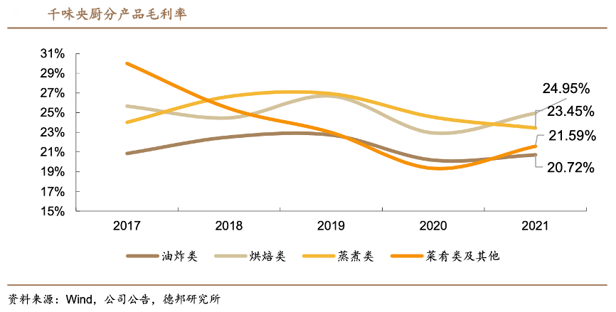 經典案例:根據wind、公司公告、德邦研究所等綜合資訊表明, 2017-2021 年,千味央廚公司產品毛利率基本穩定。公司的毛利主要來源于油炸類、烘焙類和蒸煮類產品。油炸類毛利率較為穩定, 2021 年為 20.72%;蒸煮類系列產品毛利率相對較高,2021 年的毛利率為 23.45%。