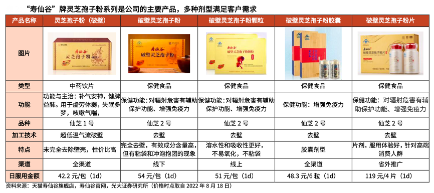 經典案例:根據天貓壽仙谷旗艦店、壽仙谷官網、光大證券研究所等綜合資訊表明,壽仙谷公司的核心產品為第三代靈芝孢子粉,目前靈芝孢子粉類產品收入占營業收入的 70%左右。“壽仙谷”為公司靈芝孢子粉的主品牌,主要采用了第三代去壁技術,此外還有“武香”、“壽仙草堂”、“武香萬延”等品牌。其中“壽仙谷”面向中高端市場,而“武香”等其他品牌面向中低端市場。
