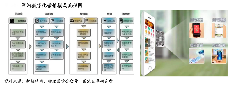 經(jīng)典案例:根據(jù)新經(jīng)銷(xiāo)網(wǎng)、宿遷國(guó)資公眾號(hào)、國(guó)海證券研究所等綜合資訊表明,洋河“數(shù)字化營(yíng)銷(xiāo)模式”通過(guò)數(shù)字化掃碼掌握消費(fèi)者實(shí)際開(kāi)瓶數(shù)據(jù)、及渠道(經(jīng)銷(xiāo) 商、煙酒店)進(jìn)出庫(kù)數(shù)據(jù),獲知需求端及渠道端數(shù)據(jù),已實(shí)現(xiàn)掌握消費(fèi)者實(shí)際 需求情況以匹配供給端發(fā)貨,形成市場(chǎng)供求關(guān)系長(zhǎng)期緊平衡的目的,并進(jìn)一步保障了控盤(pán)分利制度的落地,維持經(jīng)銷(xiāo)商積極性。