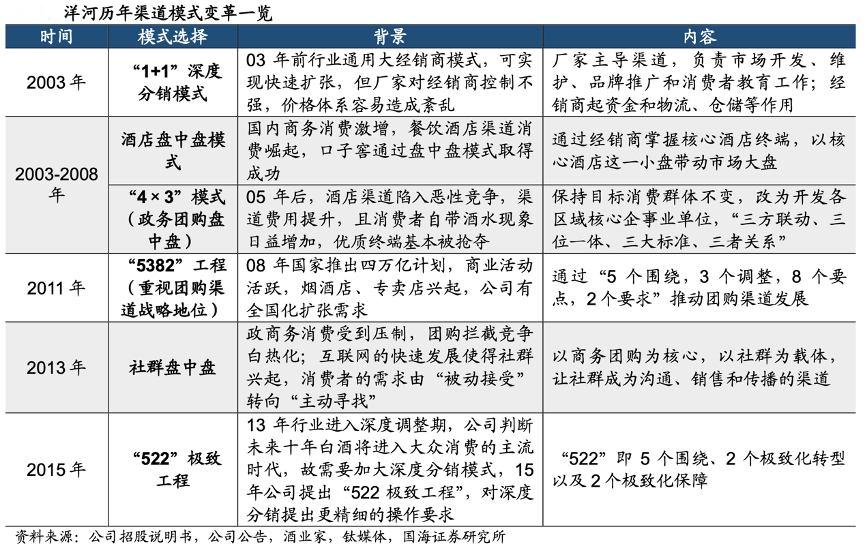 經(jīng)典案例:根據(jù)公司招股說(shuō)明書(shū)、公司公告、酒業(yè)家、鈦媒體、國(guó)海證券研究所等綜合資訊表明,洋河渠道端采取深度分銷(xiāo)、“消費(fèi)者盤(pán)中盤(pán)”等模式,并隨行業(yè)的發(fā)展不斷迭代渠道營(yíng)銷(xiāo)方式,公司首次將快消品深度分銷(xiāo)的概念引入白酒渠道,陸續(xù)推出酒店盤(pán)中盤(pán)、“4×3”、“5382”工程和“522”極致工程等營(yíng)銷(xiāo)方式,之后公司走出江蘇,基本實(shí)現(xiàn)泛全國(guó)化,2015 年省外營(yíng)收占比即提升至約 40%。
