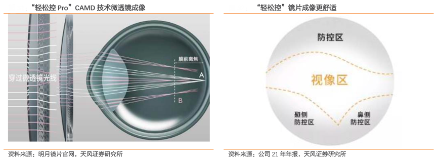 經(jīng)典案例:根據(jù)明月鏡片官網(wǎng)、公司21年年報(bào)、天風(fēng)證券研究所等綜合資訊表明,明月鏡片公司于2021年 6 月推出一代產(chǎn)品折射率 1.60 的“輕松控”,12 月推出折射率 1.67 的二代產(chǎn)品“輕松控 Pro”,全面進(jìn)軍近視防控鏡片市場(chǎng),分別采用周邊離焦眼軸控制技術(shù)(C.A.R.D)及多點(diǎn) 近視離焦眼軸控制技術(shù)(C.A.M.D),通過膜前離焦抑制眼軸過快增長(zhǎng),有效延緩近視加深。