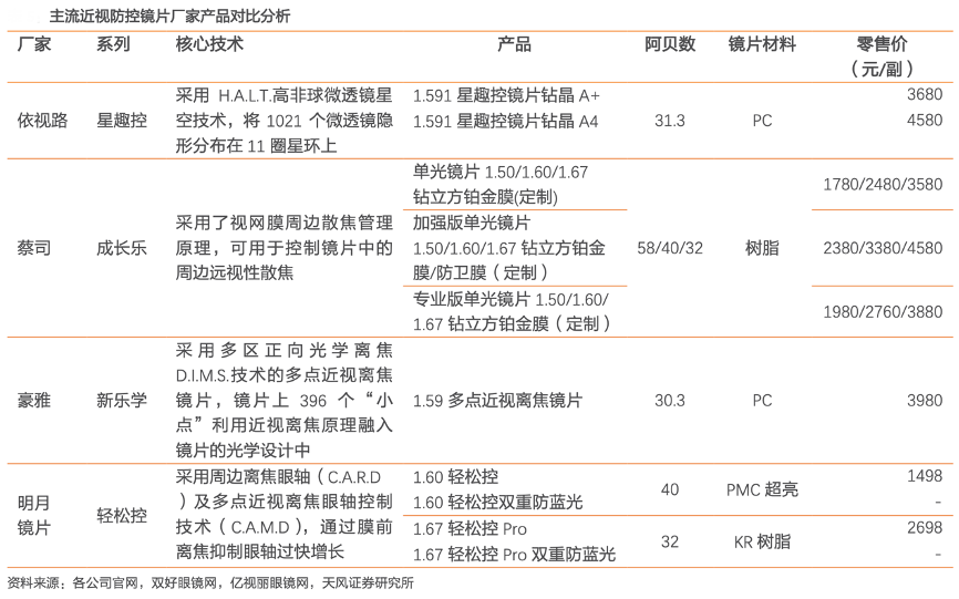 經(jīng)典案例:根據(jù)各公司官網(wǎng)、雙好眼鏡網(wǎng)、億視麗眼鏡網(wǎng)、天風(fēng)證券研究所等綜合資訊表明,由于目前消費(fèi)者對(duì)近視防控鏡片產(chǎn)品的認(rèn)知較為有限,近視防控鏡片當(dāng)前尚處于品類發(fā)展初期,各品牌紛紛布局有利于共同完成消費(fèi)者教育、培育市場(chǎng),公司產(chǎn)品有望借助終端渠道布局、憑借性價(jià)比優(yōu)勢(shì)進(jìn)一步提升市場(chǎng)份額。