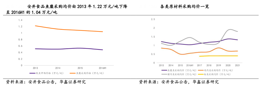 經(jīng)典案例:根據(jù)安井食品公告、華鑫證券研究等綜合資訊表明,安井食品公司對上游有較強(qiáng)議價(jià)能力。據(jù)公司招股書,2013 年至 2016H1 鰱魚價(jià)格基 本保持平穩(wěn),而安井食品魚糜采購均價(jià)由 2013 年 1.22 萬元/噸下降至2016H1 的 1.04 萬元/噸。隨著采購規(guī)模擴(kuò)大,公司對上游議價(jià)能力逐步增強(qiáng),凸顯采購成本優(yōu)勢。