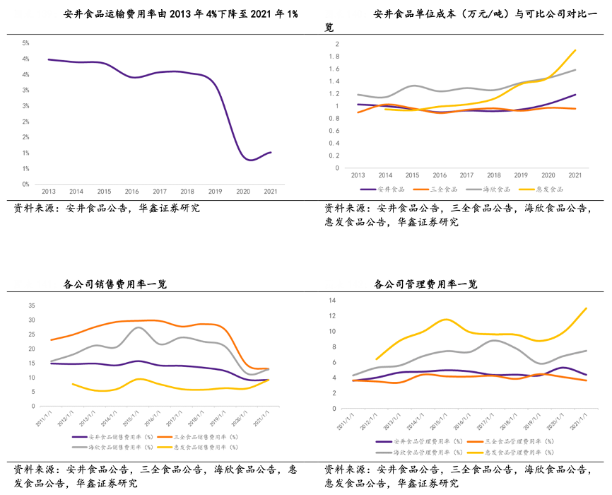 經(jīng)典案例:根據(jù)安井食品公告、三全食品公告、海欣食品公告、惠發(fā)食品公司、華鑫證券研究等綜合資訊表明,安井食品公司推行“銷地產(chǎn)”戰(zhàn)略布局, 已在全國布局 11 個(gè)生產(chǎn)基地,通過全國化布局,能夠縮小運(yùn)輸半徑,減少跨地 運(yùn)輸,節(jié)約運(yùn)輸費(fèi)用,公司運(yùn)輸費(fèi)用率由 2013 年 4%下降至 2021 年 1%。