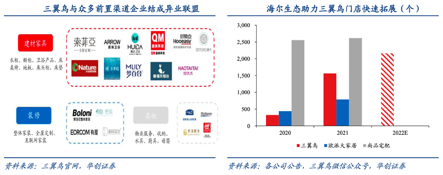 經典案例:根據三翼鳥官網、各公司公告、三翼鳥微信公眾號、華創證券等綜合資訊表明,三翼鳥成立伊始便依托海爾線下渠道迅速成長,2021年已累計建成 1563 家場景門店,超過歐派大家居門店。同時三翼鳥還積極整合家居、建材等前置渠道資源,與博洛尼、有屋等企業結成異業聯盟,以更好地布局 前端用戶入口。