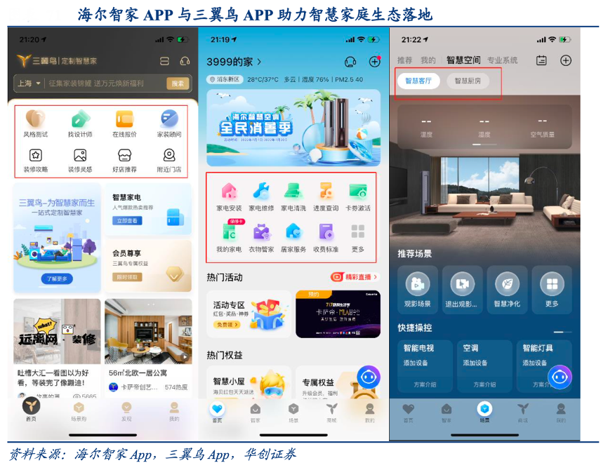 經典案例:根據海爾智家APP、三翼鳥APP、華創證券等綜合資訊表明,海爾公司先后推出海爾智家 App 與三翼鳥 App,用戶可通過線上服務管家對接需求,在實體店體驗后可通過 App 直接下單,實現線上線下銷售一體化。場景落地后亦可在 App 上操控全屋不同產品的智慧功能,以及預約清洗、維修等全流程服務。