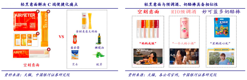 經典案例:根據天貓、各公司官網、中國銀行證券研究院等綜合資訊表明,意面由于其產品屬性(面+醬)對食品的新鮮度要求較低,能夠較好地還原餐廳的口味與品質。同時,以往的意面大多類似于國內的掛面,消費者需要自己調制醬料,但國內家庭廚房往往缺少西式調料,因此輕烹意面的出現可以解決這一需求痛點。